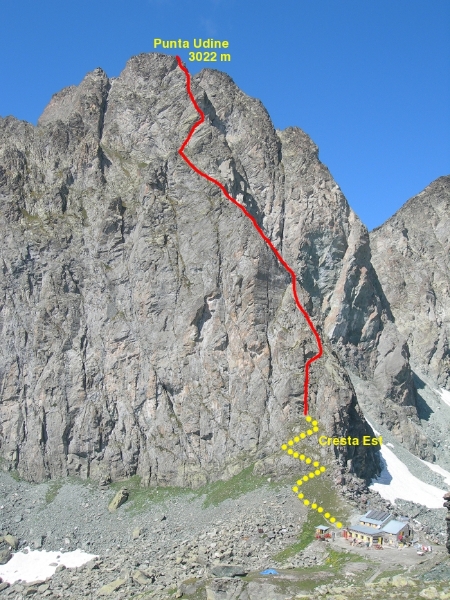 Dalla Cresta Est è possibile percorrere tutta l’aerea cengia e raggiungere la Breccia degli Angeli, marcato intaglio sulla cresta spartiacque alla base del bel muro rosso della Udine. Dalla breccia, seguendo l’itinerario della “Cresta Berhault”, si può raggiungere Punta Roma (3 ore, 4a max) e la Punta Udine (40’, 4a max), oppure, in caso di maltempo, si può scendere il canale detritico verso il Lago Porcieroles e risalire al Colle del Coulour del Porco e rientrare in rifugio (1 ora).