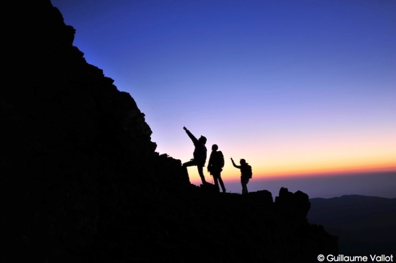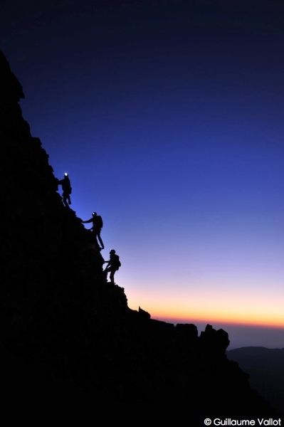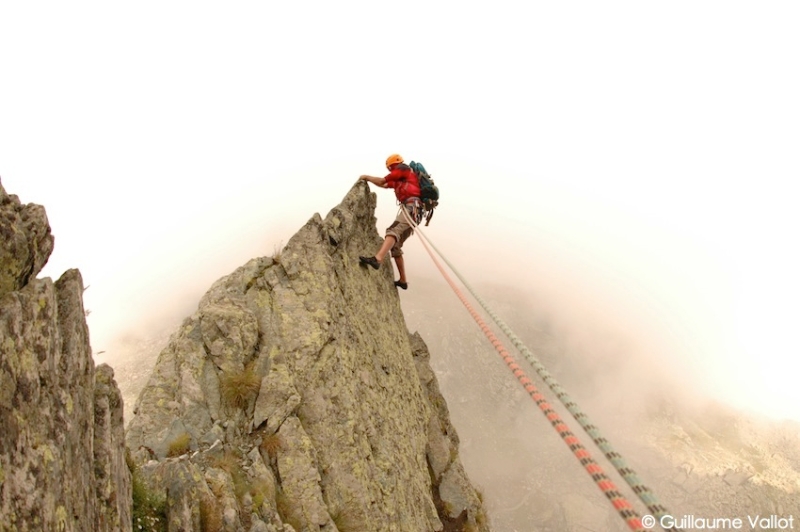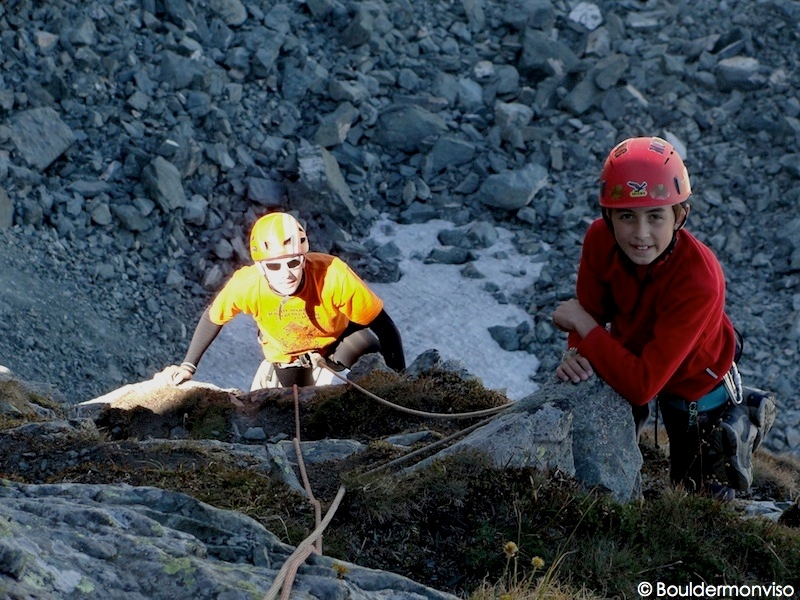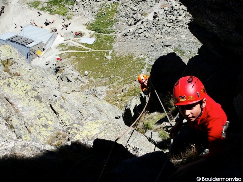 Discesa: Dalla vetta seguire gli ometti fino al Colle del Coulour del Porco e il percorso della Ferrata fino al rifugio, fino alla sosta 5 è possibile scendere in doppia.