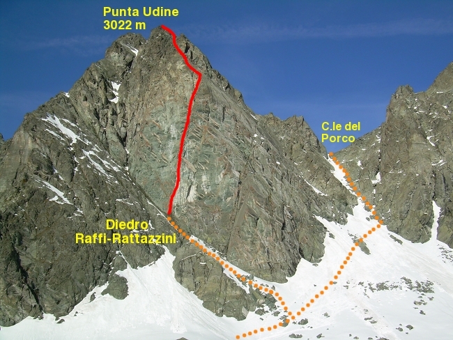 Il magnifico diedro che solca la parete Est della Punta Udine è stato negli anni dell’Alpinismo Classico uno degli itinerari di arrampicata più ambiti e prestigiosi del MonViso; l’ambiente aereo, l’arrampicata atletica e l’ottima attrezzatura ne fanno oggi una delle vie più gettonate.