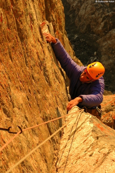 L2 30m. Ritornare nel diedro principale con un’aerea traversata, superato lo spigolo si prosegue sullo splendido muro. 5c