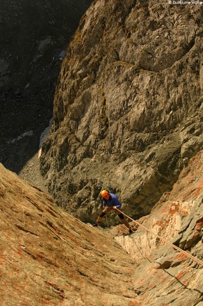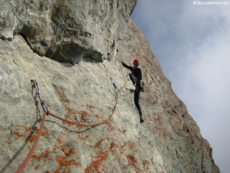 La 3° e 4° lunghezza si possono unire per raggiungere direttamente il terrazzo della sosta 4 dal quale si può scendere in doppia.