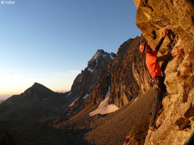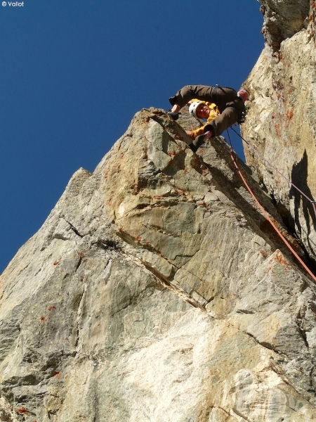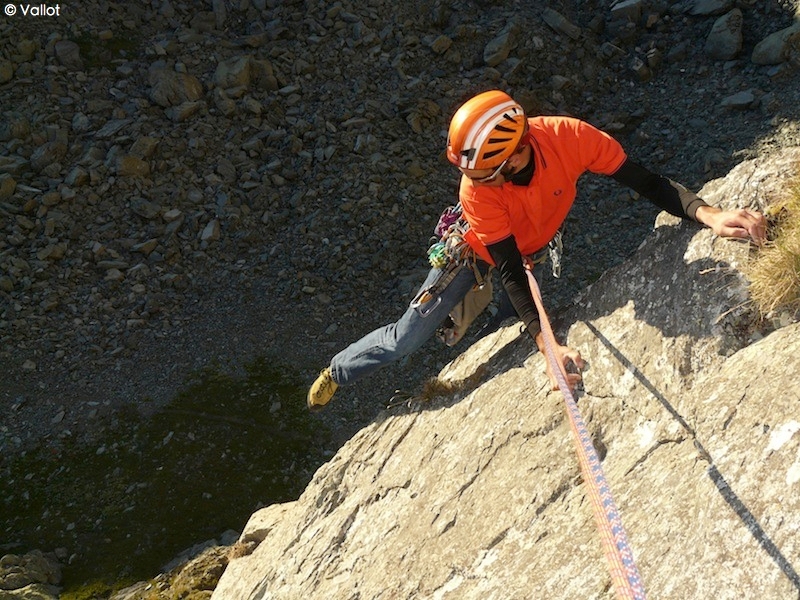 Discesa: dalla vetta seguire gli ometti fino al colle del coulour del Porco e il percorso della Ferrata fino al rifugio, dalla sosta 6 è possibile scendere in doppia (50 m) lungo l’itinerario di salita.
