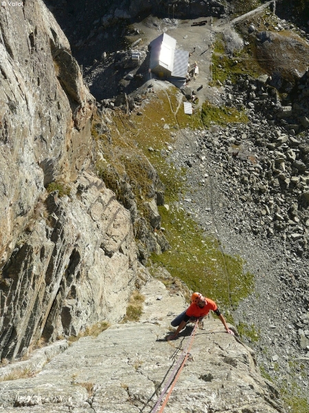 Discesa: dalla vetta seguire gli ometti fino al colle del coulour del Porco e il percorso della Ferrata fino al rifugio, dalla sosta 6 è possibile scendere in doppia (50 m) lungo l’itinerario di salita.