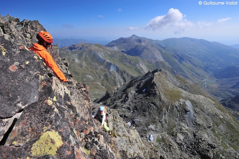 Discesa: Dalla vetta seguire gli ometti fino al colle del coulour del Porco e il percorso della Ferrata fino al rifugio, dalla sosta 4 è possibile scendere in doppia lungo l’itinerario di salita.